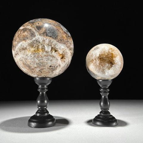 Kauniit kuutiomaiset kalkki-kristallikimpaleet ja kristallikvartsipallo, joissa on suuret piikit, jalustalla.