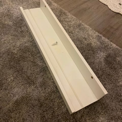 Ikea mosslada tauluhylly, väri pähkinäpuu. Ollut neljällä ruuvilla kiinni, mutta kahdet ruuvinreiät peitetty mukana tulleilla tarroilla huomamattomiksi. Ks viimeinen kuva.