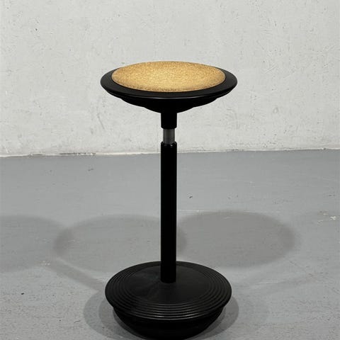 Wilkhahn Stitz jakkara, jossa on musta metallirunko ja korkkipäällysteinen istuin. Ergonominen tuoli, jossa iso korkeussäätö vara aina 60cm - 83cm asti. Alla kupera pinta, joka pakottaa istujan mikroliikkeisiin. Tämä jakkara on suunniteltu tarjoamaan dynaamista istumista, mikä edistää ergonomiaa ja mukavuutta pitkissä istunnoissa.