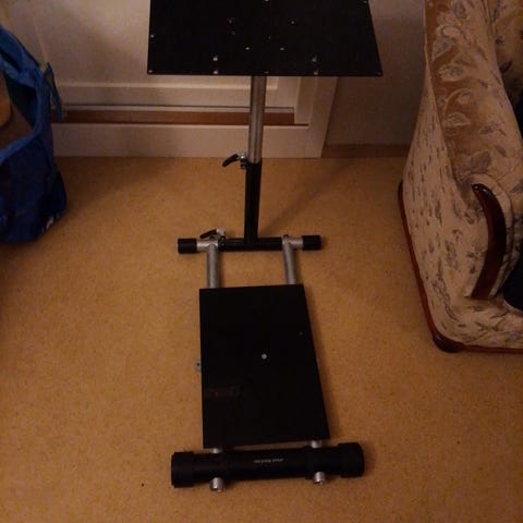 Wheel Stand Pro peliohjainjalusta, valmistettu metallistä ja muovista. Sopii erilaisille peliohjaimille ja tarjoaa vakaan alustan pelaamiseen. Säädettävä korkeus ja tukeva rakenne.
