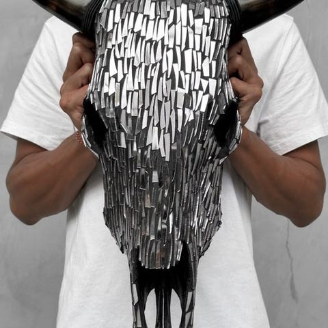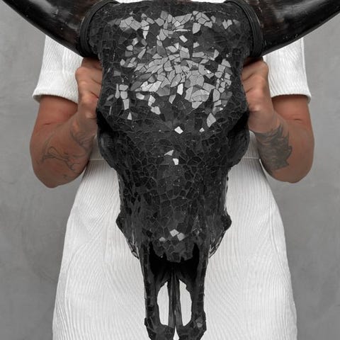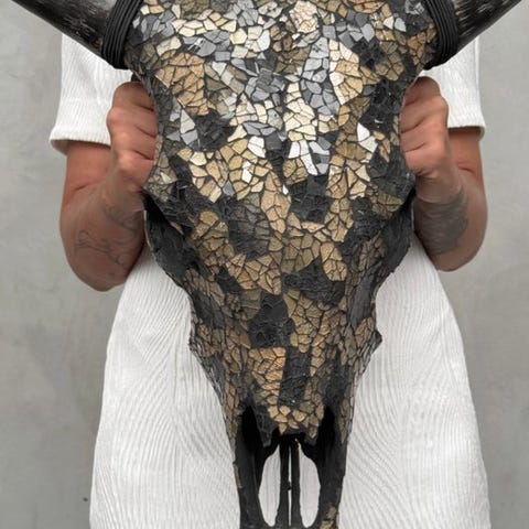 Lehmäkallo, joka on peitetty lasilla. Kallo on kokonaan käsin koristeltu suurella huolella. Se on epätavallinen, koristeellinen kappale.