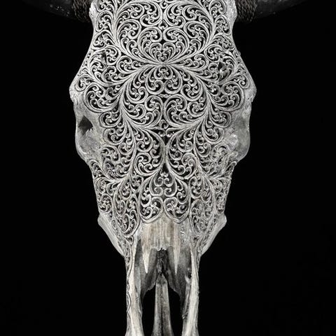 Suuri käsin kaiverrettu härän kallo, jonka ovat kaivertaneet taiteilijat, jotka ovat siirtäneet muinaisen kaiverrustaidon isältä pojalle. Kallo on täysin käsin veistetty suurella huolella. Se on epätavallinen, koristeellinen kappale.