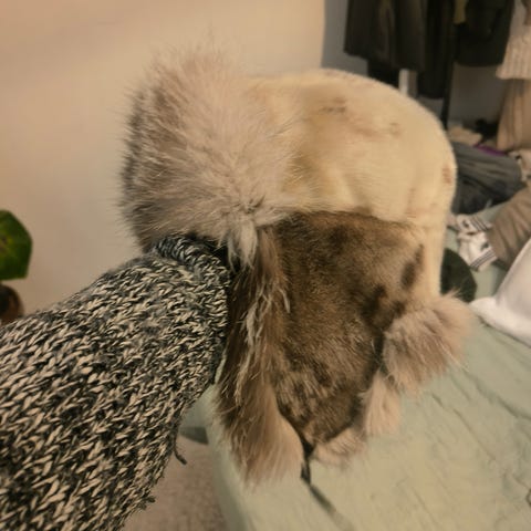 Fur hat, made from genuine leather in Hungary. The hat has been worn only three times. The gas mask is not included.
