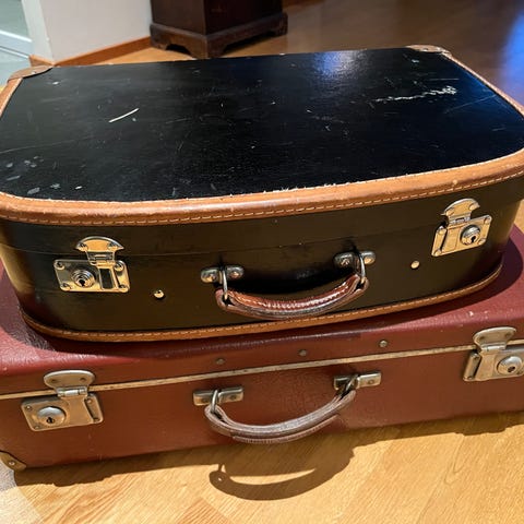 Ehjä ja hyväkuntoinen vanha vanerinen matkalaukku.
