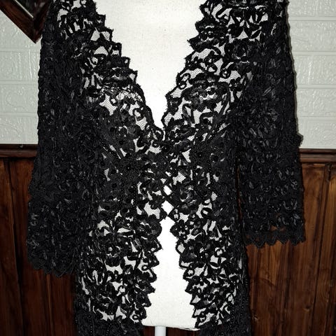 Naisten musta GARLAND pitsijakku.Musta vuori etuosassa ja selkäpuolella.Olka toppaukset.100%polyester.Vesipesu 40*. Edessä 5nappia.Vuori ei ulotu alasasti. Pituus 60cm.Hihojen pituus 37cm.Kai-kai 55cm. Koko XL.