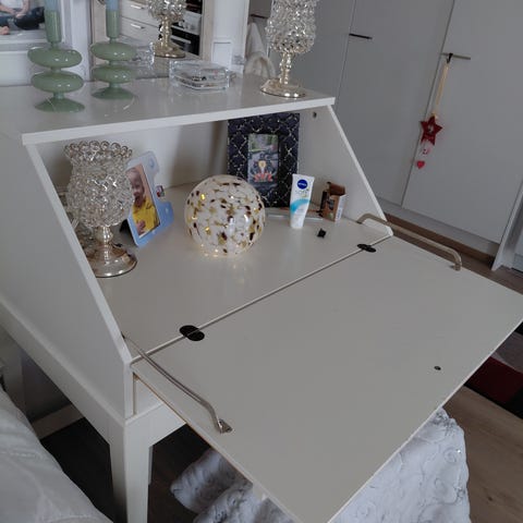 Vajaa neljä vuotta käytössä ollut Veken kirjoituslipasto. Runko musta ja ovet puun väriset. Vie todella vähän tilaa, kiinnitetään seinään. Itsellä toiminut työpöytänä pienessä asunnossa ja hyvin mahtuu läppäri sekä lisänäyttö tasolle avattuna. Tätä varten oikeaan sivuun tehty reikä johdoille. Koot: