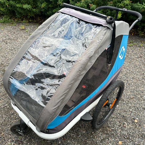 Kärry kaksi vuotta sitten ostettu ja käyttökertoja on noin parisen kymmentä, ei ollut mikään hitti meidän kaksosten kuljettamiseksi. Kärryä on säilytetty autotallissa. Kärryssä on sadesuoja ja hyttyssuoja, kaksi istumapaikkaa 5-pistevöillä, punainen takavalo, etupäähän irroitettava rengas, jolloin se toimii rattaina, ja huomioviiri. Maksimikuormitus on 45 kg. Jonkin verran saa tavaraa myös istuinten taakse.
