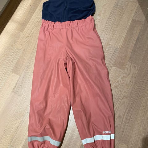 Reiman pinkkivalkoraidallinen kurahaalari ohuella vuorella. Koko 116. Kunto kuin uusi, ei kulumia, pientä haaleaa pintatahraa paikoin takalahkeessa (kuva) ja toisessa heijastimessa.