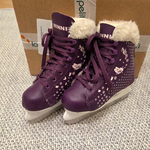 Hyväkuntoiset Minni luistimet, koko 28. Toisen luistimen kärjessä kaksi näkyvämpää naarmua (ks. viimeinen kuva), muuten hyvin pientä käytönjälkeä. Terät ovat hyvässä kunnossa.