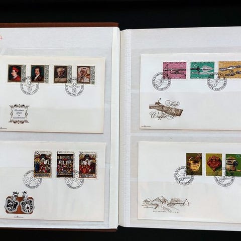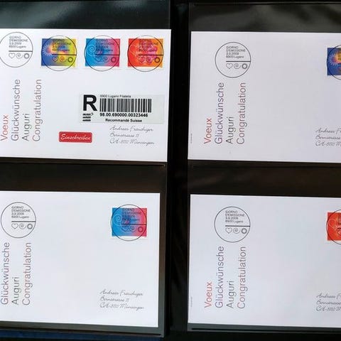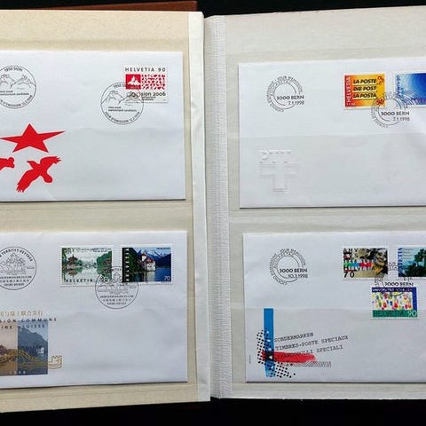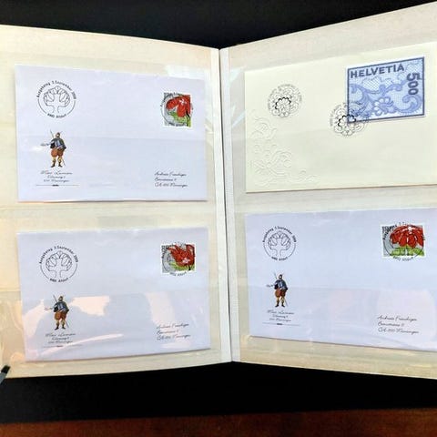 Sveitsi, FDC-ensipäiväkuoren kokoelma Biellan sisäkansiossa.