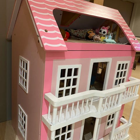 Nukkekotisetti, joka sisältää useita huonekalusarjoja, nukkeperheen ja pari koiraa. Nukkekodin ulkomuoto on vaaleanpunainen sinisellä katolla.
