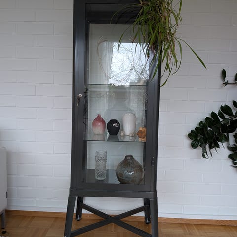Erittäin hyväkuntoinen ja kaunis vitriinikaappi. Tilava ja erittäin tukeva. 1 kiinteä hyllylevy, muut siirreltävissä. Poistunut Ikean valikoimasta, alkuperäinen hinta 499€.
