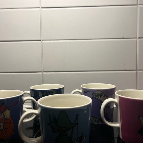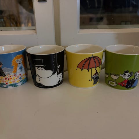 Arabia Muumi mukit, 4 kappaletta eri kuoseilla. Posliinimateriaalia, väriltään monivärisiä. Sopivat päivittäiseen käyttöön ja keräilyyn.