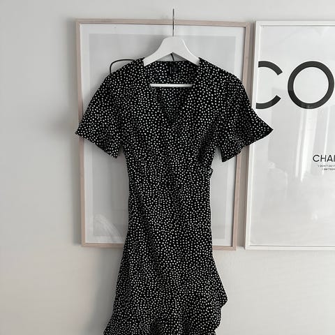 Myydään Vero Moda kietaisumekko. Valkoisia pilkkuja sinisellä pohjalla. Hyvässä kunnossa. Koko S
