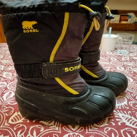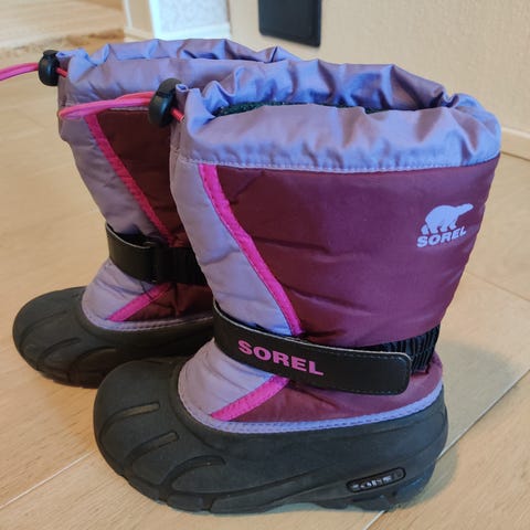 Sorel lasten saappaat tytöille, koko 30. Pohjallisen pituus 19cm eli ottaisin käyttöön jo vähän aiemmin. Saappaat ovat mustat ja valmistettu mokasta. Niissä on tukeva pohja. Lähinnä kuivien kelien kengät.