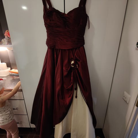 Famory upea, kullanvärinen juhlamekko/vanhojentanssipuku. Koko 38. Rinnanympärys noin 95 cm, pituus olkain-helma noin 142 cm. Tylli.