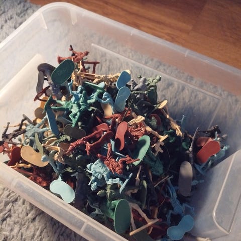 Muoviset lelu sotilashahmot eri väreissä ja asennoissa. Sisältää useita hahmoja sotilasaiheisilla varusteilla ja aseilla. Sopii leikkeihin ja keräilyyn. Länkkärit, britit ja intiaanit. Länkkäreitä 14 kpl, brittejä 27 kpl, intiaaneja 19 kpl.