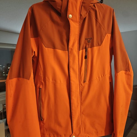 Kuvanmukainen laskettelutakki ja lasketteluhousut. Takki vedenpitävä ja tuulenpitävä. Housuista ei varmuutta, kun lappuja ei tallella. Koko miesten S.