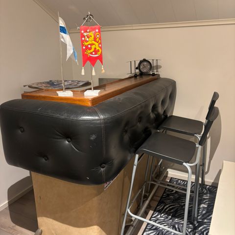 Suomessa käsityönä valmistettu laadukas kotibaari. Tiskin pituus 130cm ja korkeus 110cm. Kauppaan mukaan Boschin jääkaappi pakastelokerolla sekä tynnyrikalustesarja.