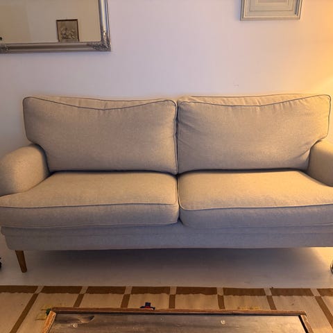 Kolmen istuttava jousitettu kangassohva, jossa istuin- ja selkänojatyynyissä irrotettavat päälliset. Lemmikitön ja lapseton talous.