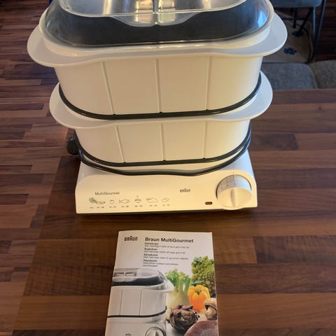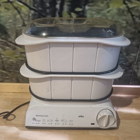 Höyrykeitin esimerkiksi juuresten ja riisin valmistamiseen tai höyrymakkaroiden. Ritiläosan pinnassa käytön jälkiä, naarmuja.