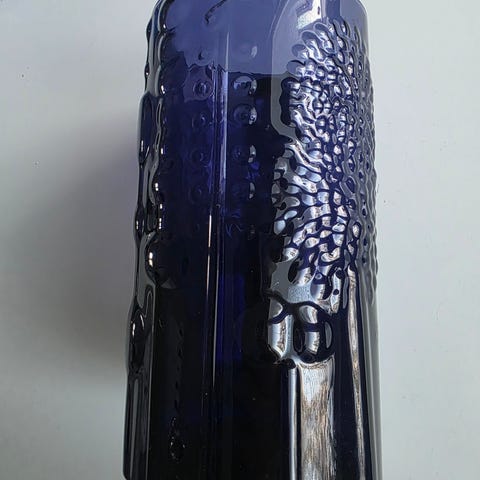 Iittala Mariskooli maljakko Ultramarine Blue. Maljakko on valmistettu lasista ja siinä on koristeellinen kuviointi.