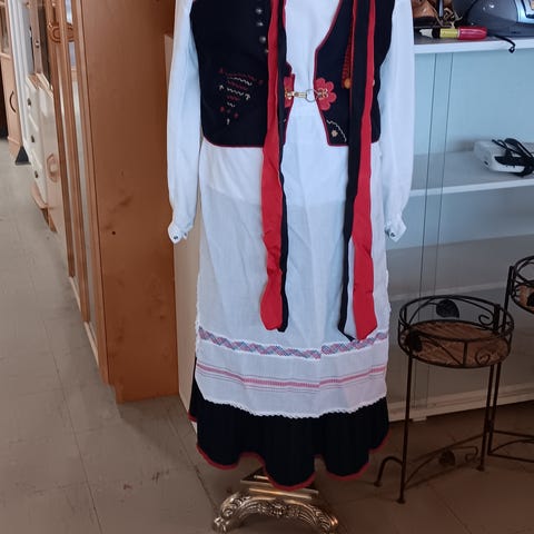 Kaksi laatikkoa kansallispukuja ja siihen liittyvää. 6 hametta, 6 paitaa, 3 kengät, 6 essua, huiveja, kankaita ja nauhoja yms.Myyn kaikki kerralla. Koko noin m ja l koon asustetta. Kaikki ehjiä. Tarjoa hintaa