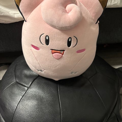 Pokemon Meowth pehmoeläin, jossa on vaaleankeltainen pää ja vartalo, oranssit jalat ja valkoiset kädet. Pehmolelu on hahmolle tyypillinen kissamainen muoto ja ilme.