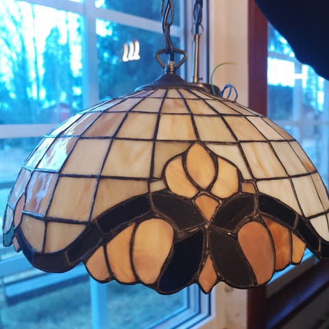 Myydään toimiva, näyttävä ja iso Tiffany kattovalaisin, kuvun halkaisija 50cm. Nouto Espoon Karakalliosta