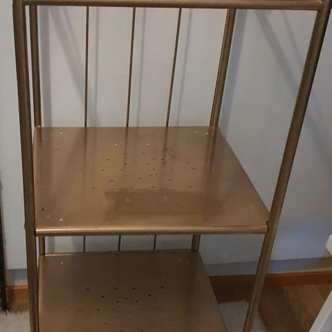 Muovinen valkoinen kylpyhuoneen hylly, jossa on neljä tasoa.