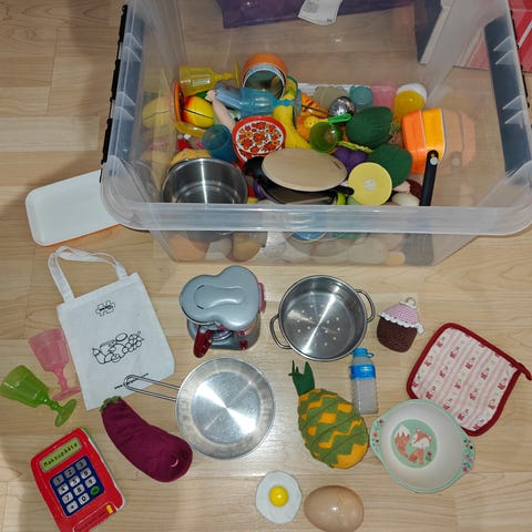 Mm. PlanToys-ruokaleluja, osa leikattavia. Leikityssä, silti siistissä kunnossa seuraaville leikkijöille. Kuvan oton jälkeen löytyi vielä ainakin yksi, juusto-lelu. Toridiilin lisäksi onnistuu nouto Tampereen keskustasta.