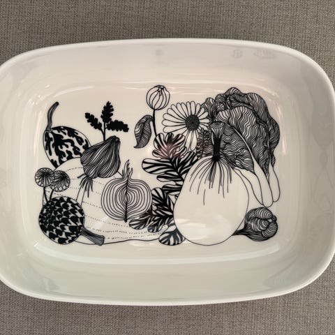 Marimekon siirtolapuutarha tarjoilukulho, meillä käytetty uunivuokana. Todella siisti, jotain minimaalista käytönjälkeä voi olla, minusta ei uudelle häpeä.