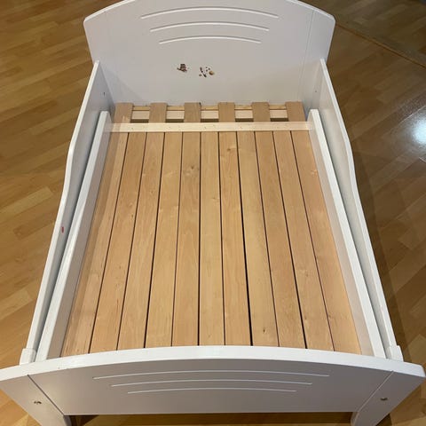 Lastensänky, leveys 90 cm, pituus 200 cm. Ihanan keltainen ja tukeva puusänky vaneripohjalla. Pappilassa. Omat kantajat, sänky omakotitalon toisessa kerroksessa.