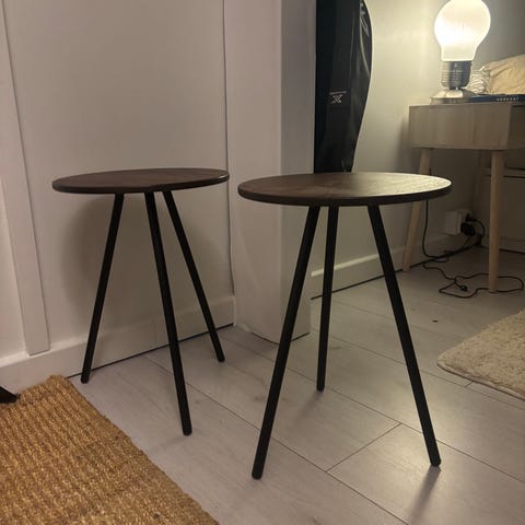 Itse tehdyt yöpöydät, puuta. Vaaleanpunaiset ja söpöt aaltopaneloinnit :-) Irrotettavat hyllyt. Vähän kulumaa!