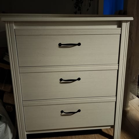 Puinen tumma lipasto hyvässä kunnossa, jossa vetolaatikot.