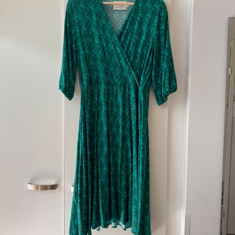Noukin ihana Puffi-merinovillamekko. Kuosina vihreä Apila, jossa on kauniita metsänvihreän ja salvian sävyjä.