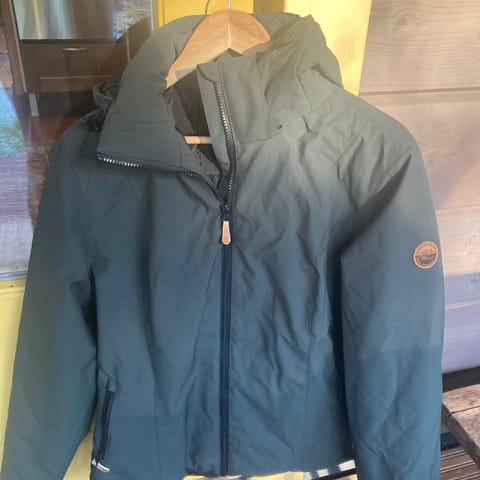 Kaksi vetoketjutaskua ja yksi iso sisätasku. Irroitettava huppu, kainaloiden alla vetoketjulliset tuuletus aukot. Uusi, vain laput irroitettu!