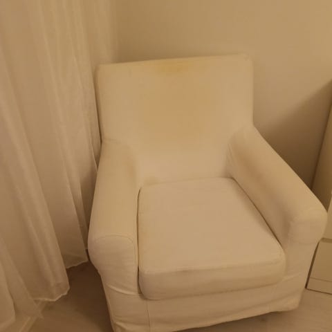 Nahkassa on käytönjälkiä mutta on edelleen erittäin hyvä istuttava. Käsinojat olleet vaalean puun väriset mutta maalattu itse valkoisiksi