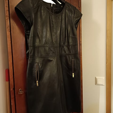 Ellos nahkamekko mustassa värissä, koko 36. Mekko on valmistettu nahasta ja siinä on vetoketjutaskut edessä. Mekossa on lyhyet hihat ja takana vetoketju.