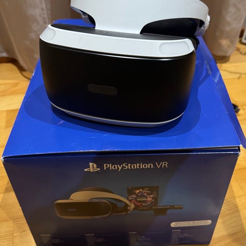 Sony PlayStation VR virtuaalitodellisuuslaite PlayStation-konsolille. Mukana ohjain ja liitäntäkaapelit. Väri valkoinen ja musta.