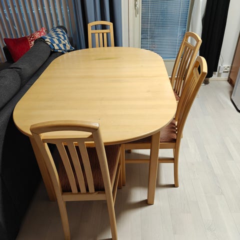 Annetaan valkoinen pyöreä ruokapöytä. Pinnassa naarmuja ja jälkiä, mutta muutoin on hyvässä kunnossa. Nouto Hml 13500 alueelta.