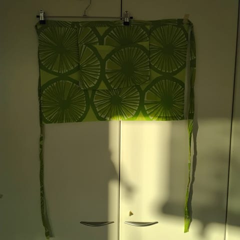 Marimekon essu, edessä iso tasku, kaula lenkki nepparilla, nauhojen pituus vyötäröllä päästä päähän 246cm