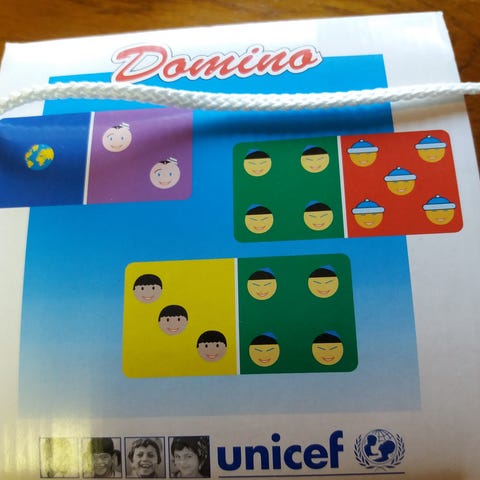 Myydään Unicef Domino-peli. Pelilaatat ja ohjeet tallessa. Laatat ovat kaksipuoleiset, toisella puolella on selkeitä värikkäitä kuvia ja toisella perinteiset pisteluvut. Peli soveltuu 3-vuotiaille ja sitä vanhemmille. Peli tukee visuaalista oppimista ja leikkiä.