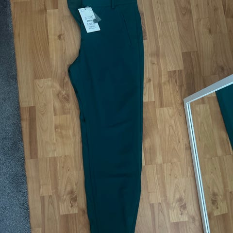 Vihreät, ehkä hieman minttuiset puuvillahousut. Tosi kivat ja mukavat päällä, itselle käyneet liian piukiksi, ei kerenneet montaa kertaa olla päällä. 4 taskua, hieman lyhyempi malli.