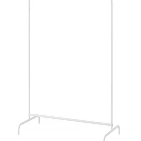 Valkoinen korkeudeltaan säädettävä renkaallinen vaaterekki, pientä kulumaa maalipinnassa henkareiden jäljiltä.