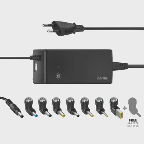 Hama Universal Notebook Power sovitin, teho 90W. Sopii useille eri kannettavien malleille, mukana useita liitäntäpäitä. Jännite 15/18V, käyttöjännite 100-240V. Väri musta.