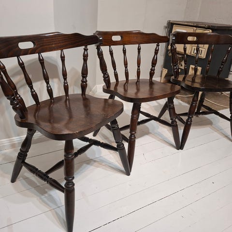 Näyttää Bonanza tuoleilta, mutta ei taida olla. Kolme kappaletta. Hiukan kuluneita, mutta se ei käyttöä haittaa. Päälle voi laittaa esim. taljan.