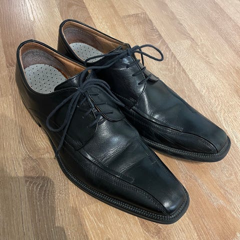 Uutena ostettu, yhden kerran juhlissa käytetty. Ortholite pohjalliset. Erittäin hyväkuntoiset mustat nahkakengät.
