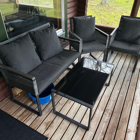 Ulkokalustesetti (mattamusta / rauta), sisältää 2 x tuolit, pöydän ja ”puiston penkin”. Vähän sisältää käytön kulumaa 120e.