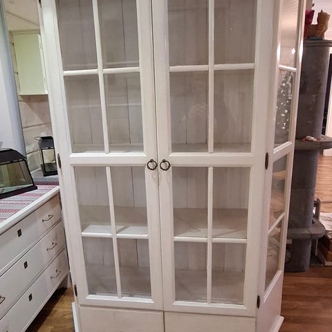 Lasivitriini, jonka takaseinä tapetoitu. Katossa lamppu, joka ei olenollut pistorasiassa kiinni varmaan 10 vuoteen, joten sen toimivuudesta en uskalla sanoa. Toiminut, kun viimeksi ollut käytössä.